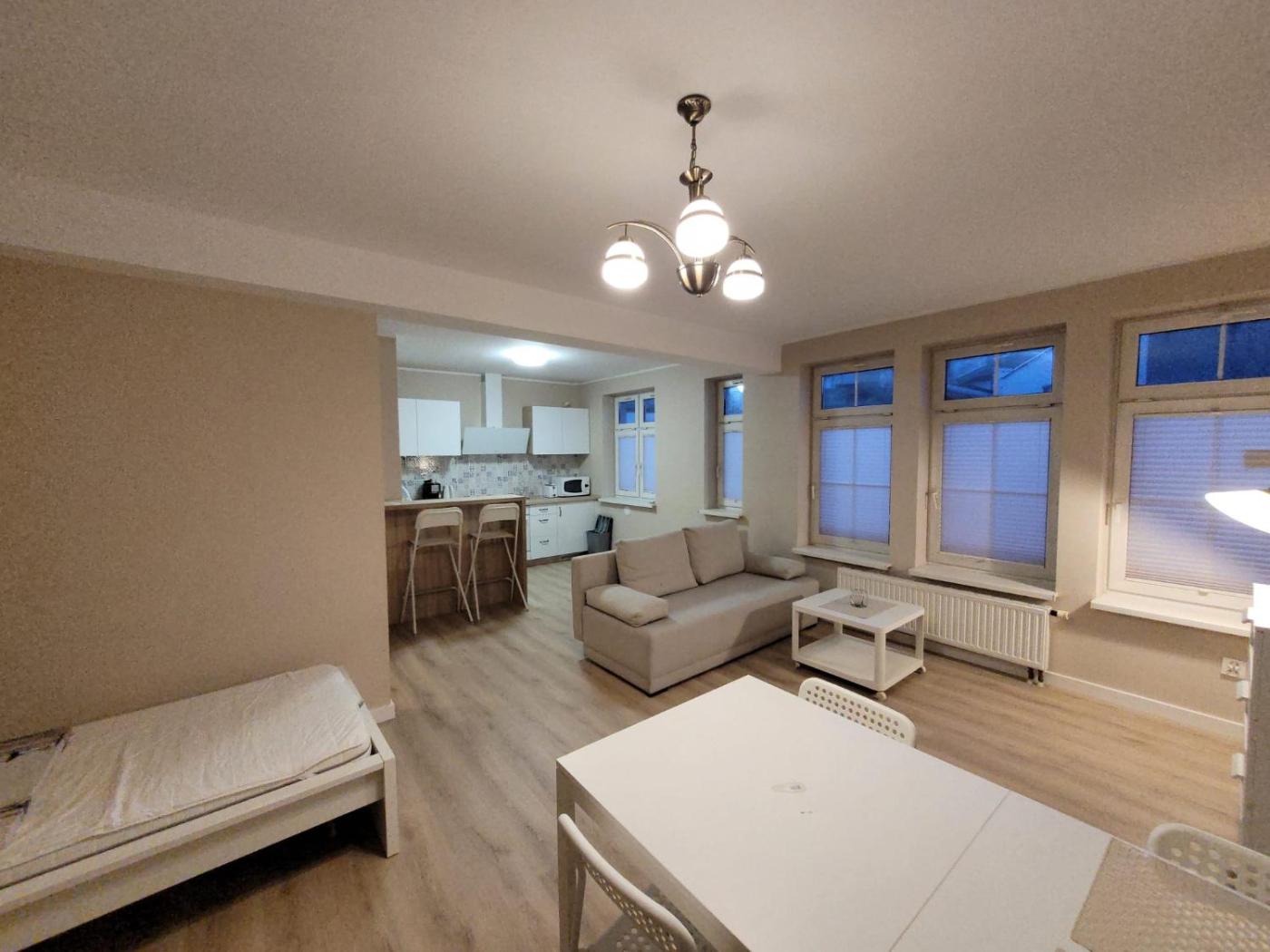 Apartament z 1 sypialnią. Guests can make meals in the kitchenette that features a stovetop, a refrigerator, kitchenware and an oven. The apartment features a washing machine, a coffee machine, a dining area, a wardrobe and a flat-screen TV. The unit has 2 beds. Apartament - 3 osobowy. Powierzchnia pokoju ok.: 20 mkw.