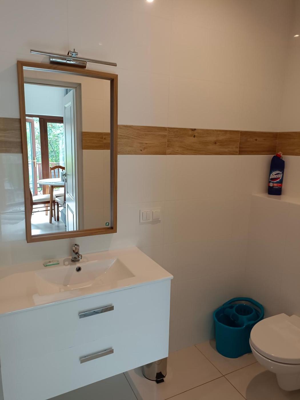 Apartament z tarasem. Featuring a private entrance, this air-conditioned apartment comprises 1 living room, 1 separate bedroom and 1 bathroom with a walk-in shower and a hairdryer. Guests will find a stovetop, a refrigerator, kitchenware and a microwave in the fully equipped kitchenette. The apartment also provides guests with a barbecue. Boasting a terrace with garden views, this apartment also provides a tea and coffee maker and a flat-screen TV. The unit offers 2 beds. Apartament - 4 osobowy. Powierzchnia pokoju ok.: 25 mkw.