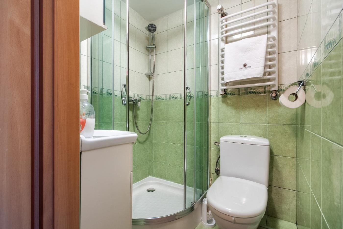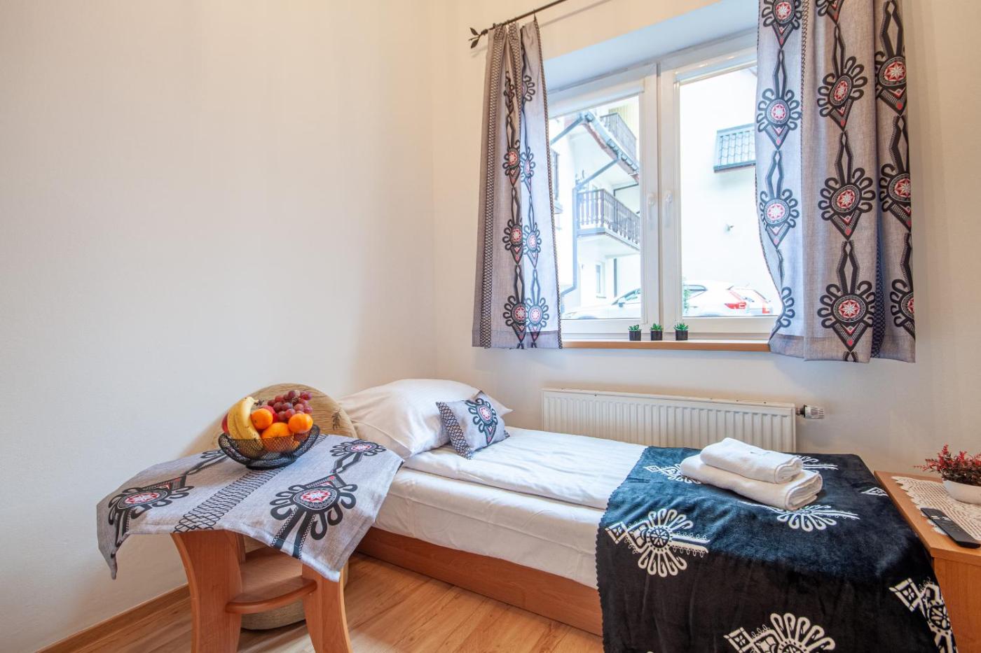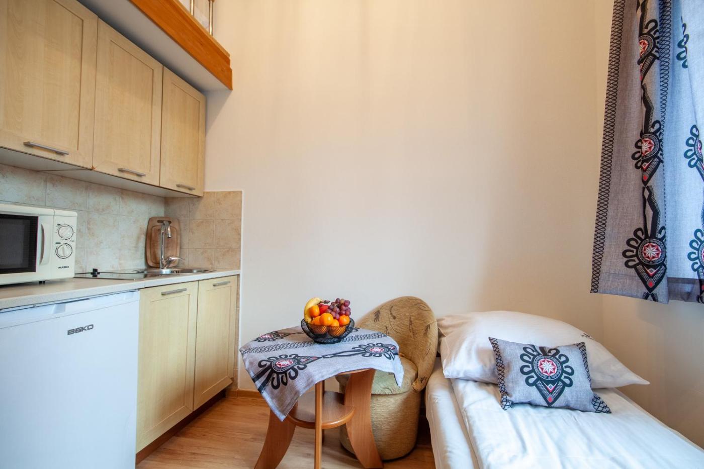 Apartament typu studio. This apartment comprises 1 bedroom, a kitchenette and 1 bathroom with a shower and a hairdryer. Guests can make meals in the kitchenette that comes with a stovetop, a refrigerator, kitchenware and a microwave. The apartment provides a wardrobe, an electric kettle, heating and a flat-screen TV. The unit offers 1 bed and 2 futons. Apartament - 3 osobowy. Powierzchnia pokoju ok.: 15 mkw.